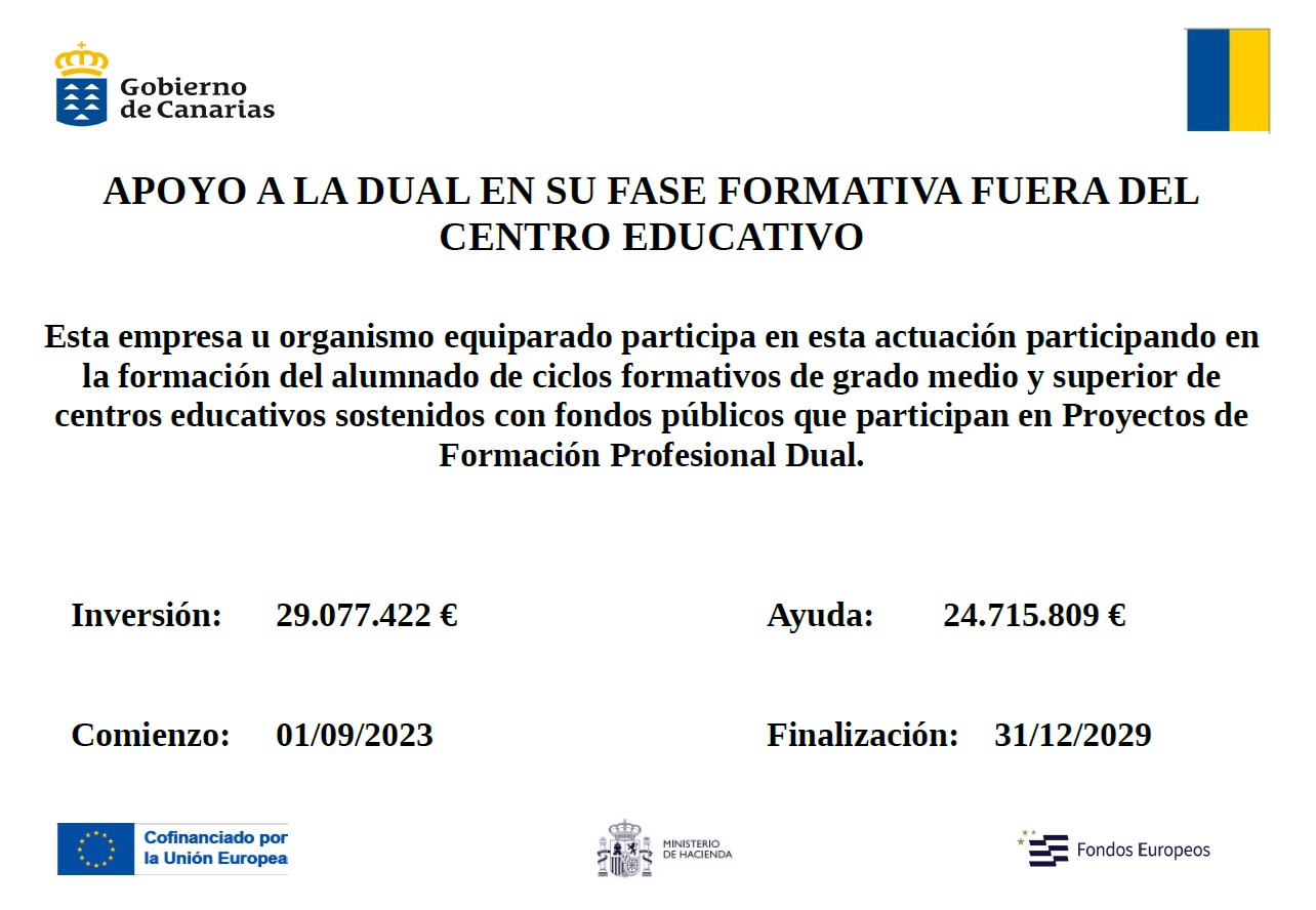 Ascanio Química S.A. ha sido entidad beneficiaria de las subvenciones a empresas y organismos equiparados del sector privado, participante en operaciones cofinanciadas por medio del Fondo Social Europeo Plus, dentro del Programa FSE+ 2021-2027 Comunidad Autónoma de Canarias, pertenecientes a la actuación Apoyo a la Dual en su fase formativa fuera del centro educativo.